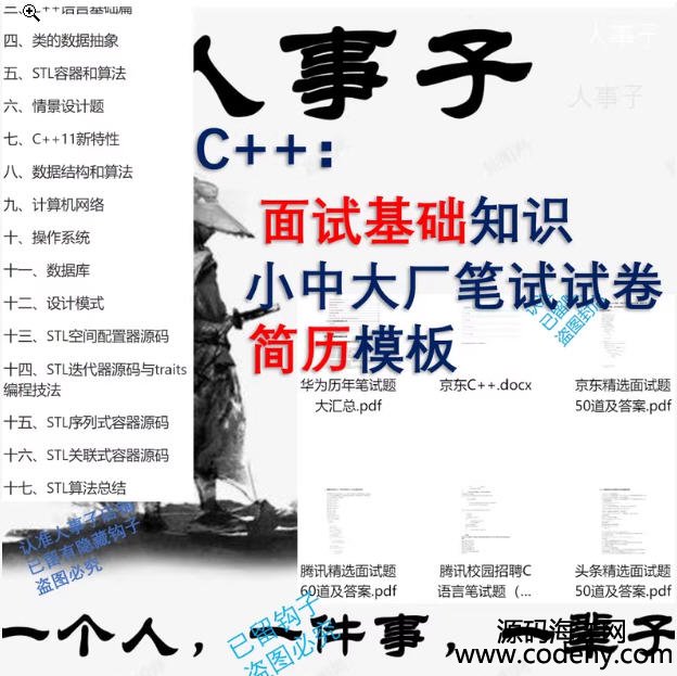 [號外]新品大促銷,買了后送全店筆記和面試題,你只要招工做,無論哪個(gè)行業(yè)都能用上 有道無術(shù),術(shù)尚可求,有術(shù)無道,止于術(shù) 有魚有漁:c++就業(yè)必備知識+公司試題 內(nèi)容包括不限于C++基礎(chǔ)知識、設(shè)計(jì)模式、場景設(shè)計(jì)題、數(shù)據(jù)結(jié)構(gòu)與算法、計(jì)算機(jī)網(wǎng)絡(luò)、數(shù)據(jù)庫、操作系統(tǒng)和圖解STL源碼等。 外加2000道面試題+大批量公司試卷 學(xué)習(xí)練習(xí)筆試面試簡歷一條龍打通 愿君前程似錦